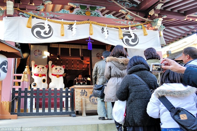 Tượng mèo Maneki Neko được đặt ở khắp nơi trong khuôn viên đền
