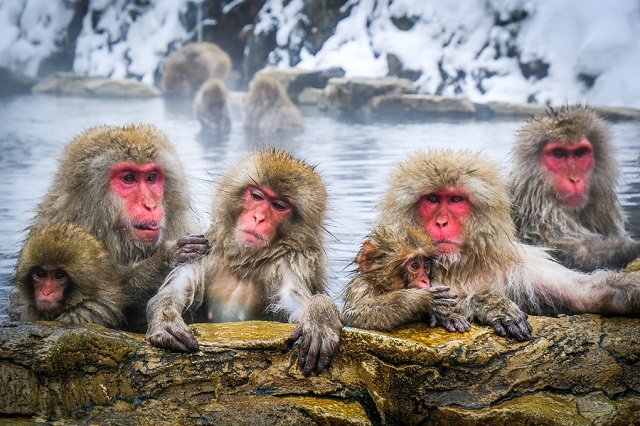 Thực tế, người ta đã quan sát những chú khỉ thường tắm tại công viên khỉ Jigokudani trong nhiều năm như một cách để chúng giữ ấm cơ thể trong mùa đông khắc nghiệt ở Nagano. Giữa bốn bề là tuyết, những chú khỉ đang ngồi yên trong làn nước bốc hơi như thể đang tận hưởng hơi ấm và sự thư giãn khi những bông tuyết rơi xuống mặt chúng. Bạn cũng bắt gặp những chú khỉ nằm thư giãn trên những tảng đá xung quanh, thậm chí trên đường đi bộ.