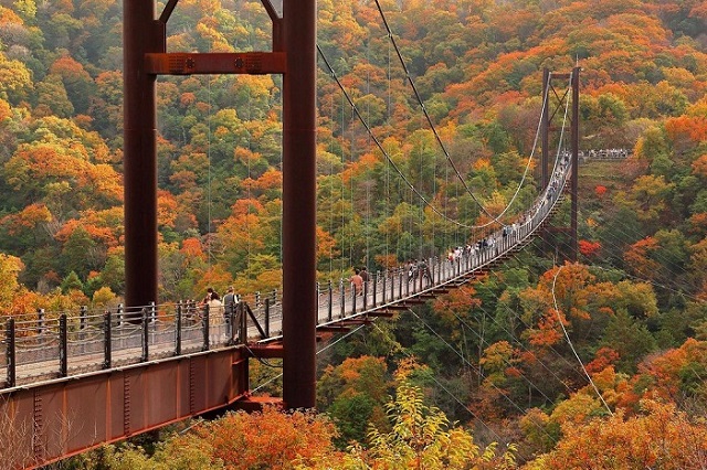Nếu bạn đang tìm kiếm một địa điểm để vừa leo núi, vừa ngắm lá vàng lá đỏ thì cầu treo trong công viên Hoshida là gợi ý đáng tham khảo. Để đến được cầu treo, bạn sẽ mất khá nhiều thời gian đi qua hết các cung đường. Dù vậy, khi đứng trên cầu, bạn sẽ được ngắm nhìn một vùng trời rực rỡ sắc màu trải dài mênh mông. Đó là một phần thưởng xứng đáng để bạn bỏ thời gian và công sức để khám phá đấy.