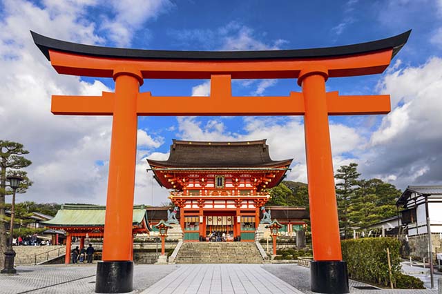 Đền Fushimi Inari taisha hay còn được gọi với tên gọi khác là đền thờ Inari jinja hay Oinari-san. Tương truyền thì ngôi đền này được xây dựng vào năm 711, với diện tích khuôn viên lên đến 870.000 m2. Đền thờ Fushimi Inari taisha nổi tiếng với đường hầm "Zenbon Torii" với rất nhiều cổng Torii màu đỏ son nằm trong khuôn viên chùa Fushimi Inari taisha. Hàng năm có rất nhiều người đến đây cầu nguyện để được làm ăn phát đạt, kinh doanh thuận lợi. Có nhiều người mang lễ đến để tạ ơn, họ mang nhiều cổng Torii đặt ở đền. Hiện tại số lượng cổng Torii đã lên tới khoảng 10.000 cái. Vị thần được thờ ở đền Fushimi Inari taisha là thần Inari-Daimyojin nổi tiếng linh ứng đối với những lời cầu nguyện về lộc buôn bán, mùa màng bội thu.