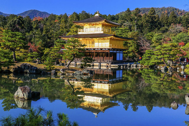 Đền Kinkaku – ji với tên gọi khác là Golden Golden Pavilion. Ngôi đền đặc biệt nổi tiếng và mang tính biểu tượng của đất nước Nhật Bản khi được dát vàng ở phía ngoài. Chính sự phản chiếu của sắc vàng lấp lánh lên mặt hồ tạo nên sự ngoạn mục.
