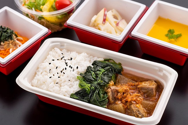 Trên khoang hạng phổ thông, hành khách sẽ được thưởng thức nhiều món ăn hấp dẫn mang nhiều màu sắc khác nhau, chẳng hạn: mỳ Ý cá hồi & Millet, sườn bò & hạt dẻ, Soraben,… Với những hành khách quá cảnh, cũng sẽ được cung cấp thực đơn với các món ăn khác nhau ngay tại khu vực phòng chờ.